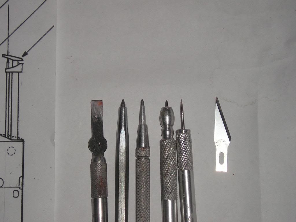 My favorite tool for the base scribing is the second from the left; it has a good feel to it and seems to hold a sharper edge. You can also go quite deep with it, but I use it mostly for the initial stages of scribing. To its right are various machine scribes that will give me varying degrees of width to the scribe. I use the two tools on the right for touching up and tweaking scribes, and on the far left is a no. 17 Exacto blade, the best thing I’ve found to date for applying air dry red putty for localized filling work.
