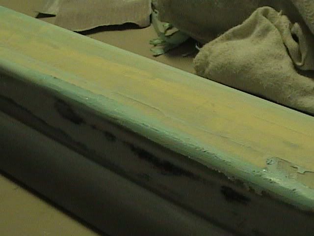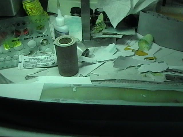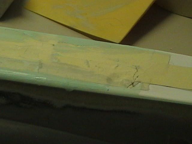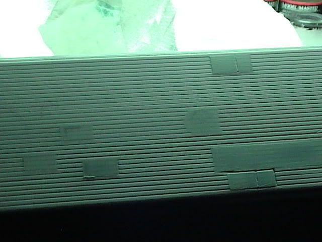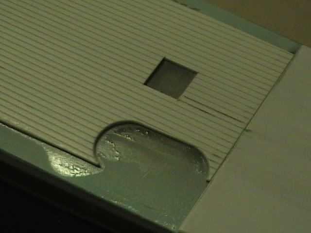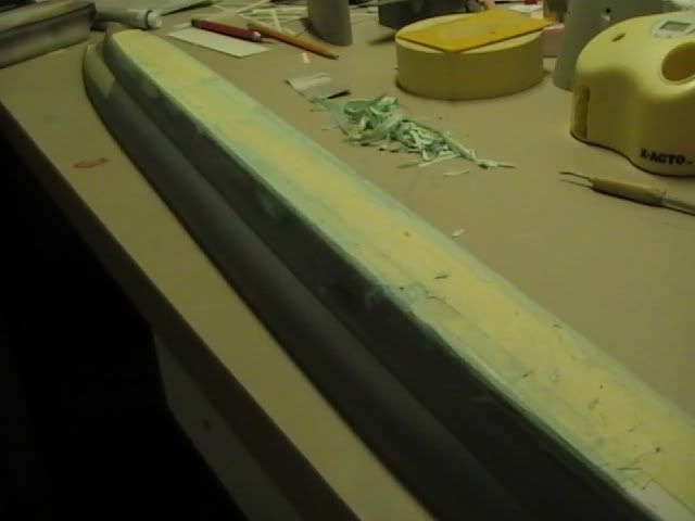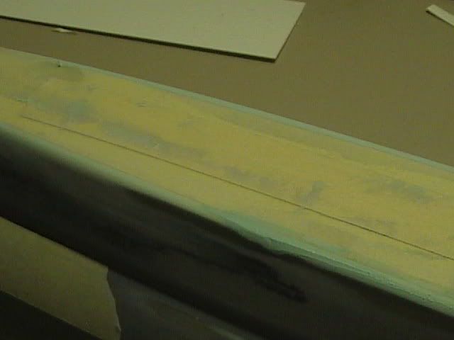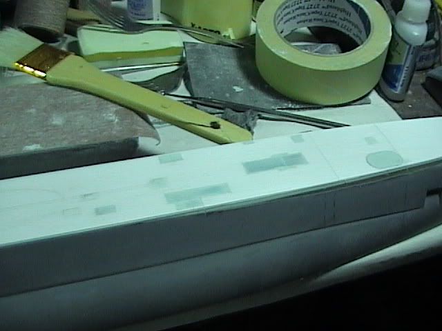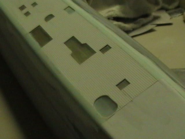 The super structure roll from the side, too the deck planks was done the same on this model as before. For this the deck planks are set in about two feet from the roll, then taping over my deck plastic I used glaze to fill in the depth difference between the side edge and the deck plank's. After sanding the roll of the Superstructure I applied a light prime to show and pinholes. Very light so that none of the deck plastic is filled in at any time.