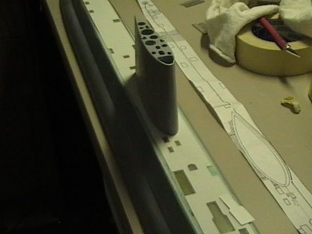 With each section in place I taped over the plastic to protect it form sticky fingers, I can’t tell how many times in the past I learned the hard way until I took the 5 second step! With all for sections in place I trimmed off the excess plastic form the deck and blocked edge to the superstructure. With that done I went to my plans and a 1/96th measuring ruler to begin the placement of detail in pencil to the deck. Again with the center line measured and a Mechanic’s square in front of the bow to pull length from, all the placement of the hatches, cleats, torpedo loading doors, and such can be place very precisely!