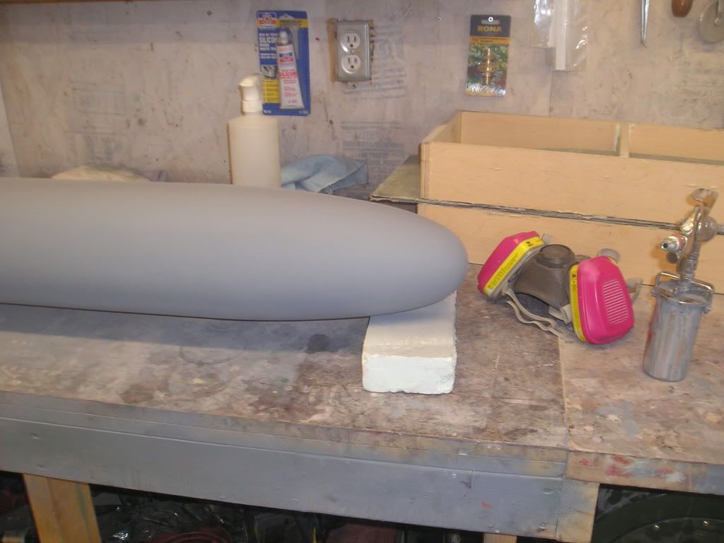 I did a light coat of black spray paint over top of my grey primer coat. I used the cheap stuff because it gets sanded off anyway, but I almost regret using this garbage even for this task. It takes a long time to dry, and when it does it plugs up sandpaper like that was its sole mission in it life. Once dry this paint coat is lightly block sanded, and in doing so we get these miraculous black spots left over. These are the low spots we need to get rid of. I’ll fill these with red putty, let dry, block sand, prime in grey and repeat this “black paint low spot hunting” routine until I find no more low spots...voilla! The first step to the Class A finish is done.