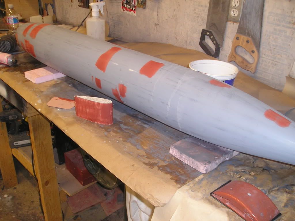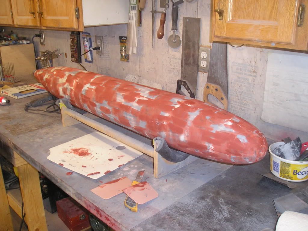 After sanding the primer down I used a plastic Bondo spreader and coated the whole hull with red Evercoat glaze, paying particular attention to make sure the low spots were filled out. When dry, almost the entire glaze coat was sanded down, leaving just a few red spots here and there. I don’t want to see a lot of red left on there because that is not the purpose of this product. Its use is to fill minor imperfections like low spots and scratches. Pretty boring stuff for you guys to read, but essential nonetheless to get a good finish.