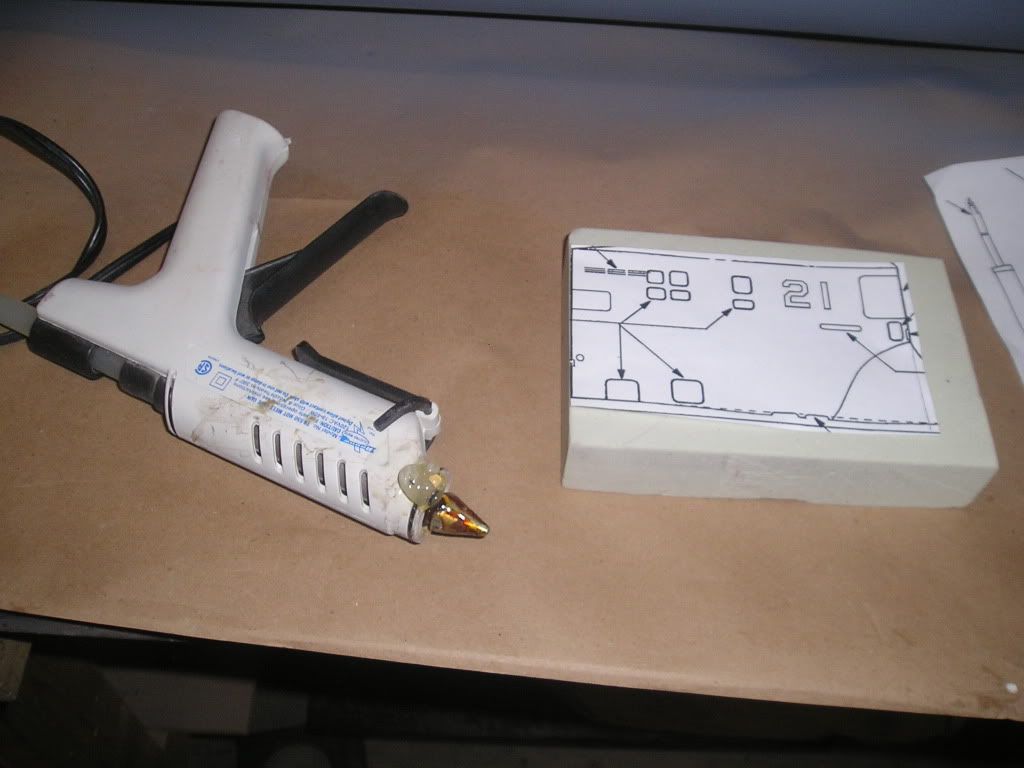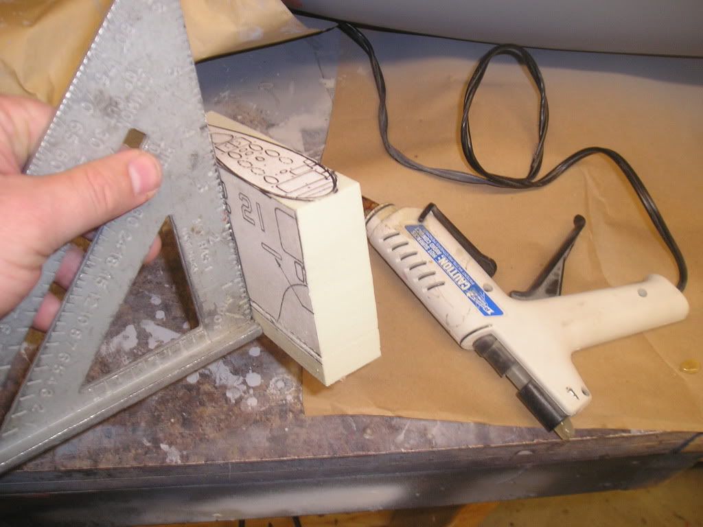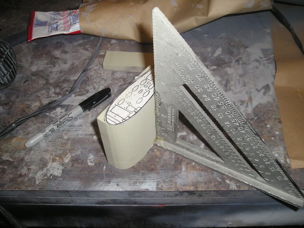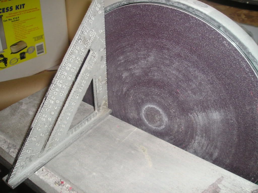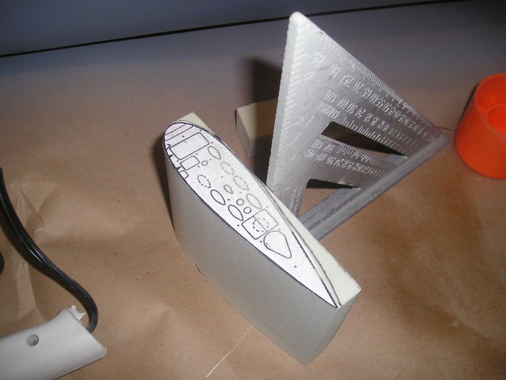 Creating the base was started by taking a perfectly square piece of Renshape and CA gluing cut-outs of the sail shape both side and top. The bottom of the sail is not perfectly straight because of its teardrop shape that follows the curing hull. I cut this line using my scroll saw and then temporarily hot melt glued it back into place. I ensured that my table for my disc sander was absolutely square in relation to the sanding disk. I hot melted the side of the Renshape block to my square let cool and went at removing material knowing that what I was doing was square. When the material from one side was removed I moved the square to the other side of the sail. This is pretty much the same thing I did on my Permit...might as well because it works very well.