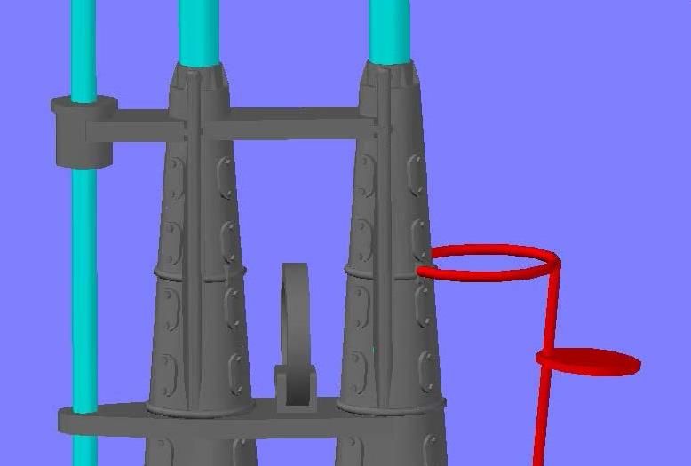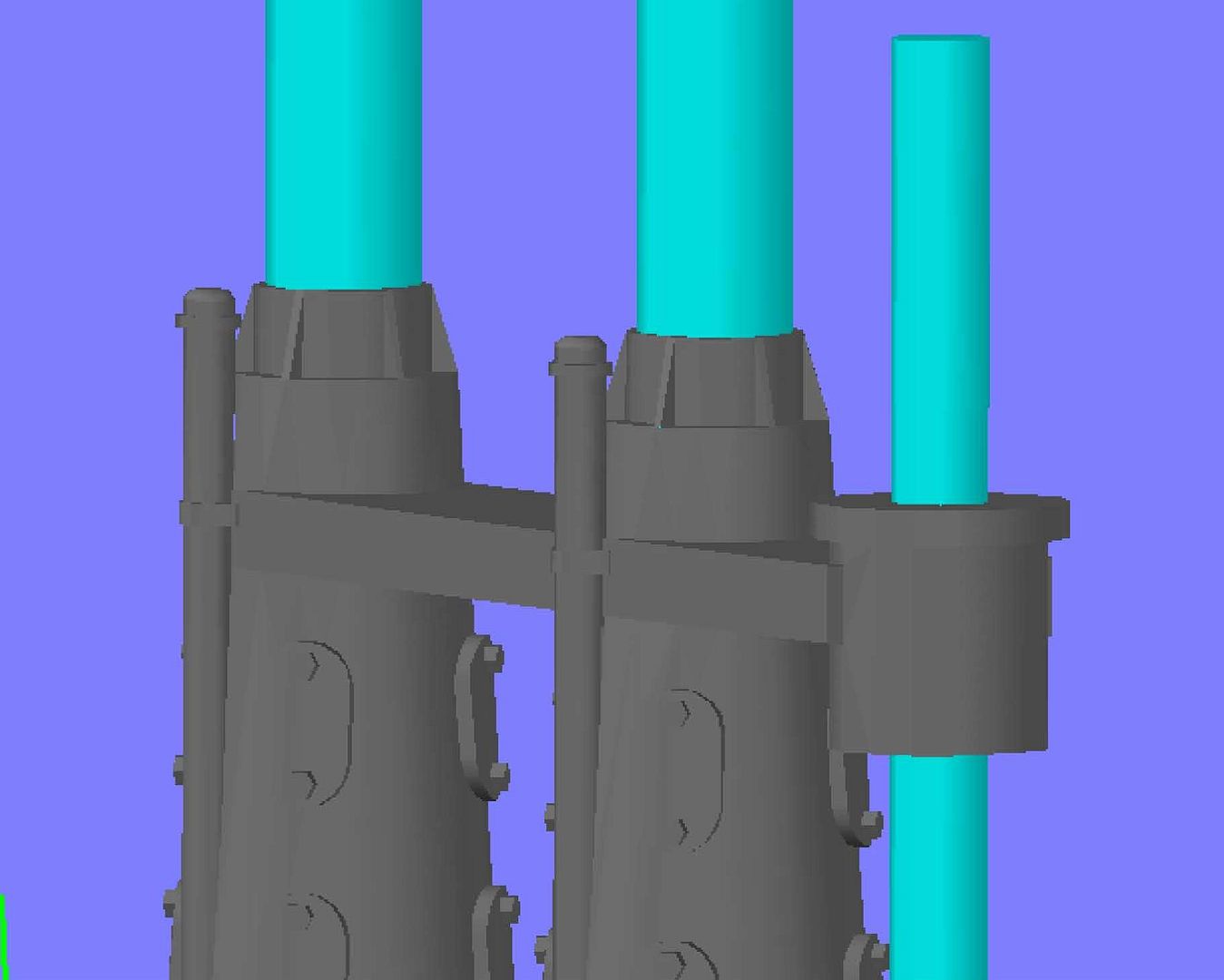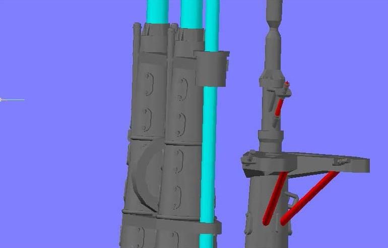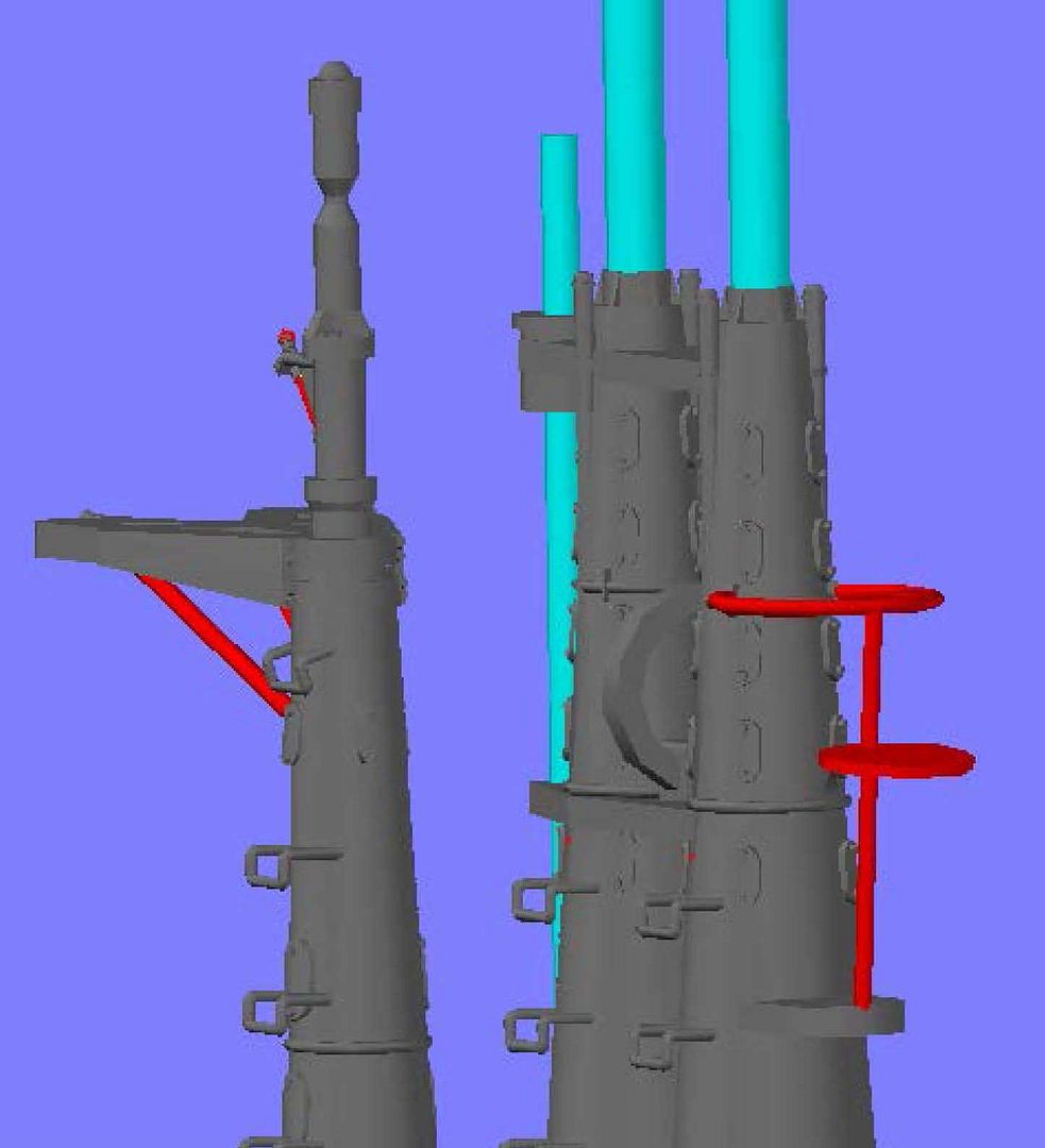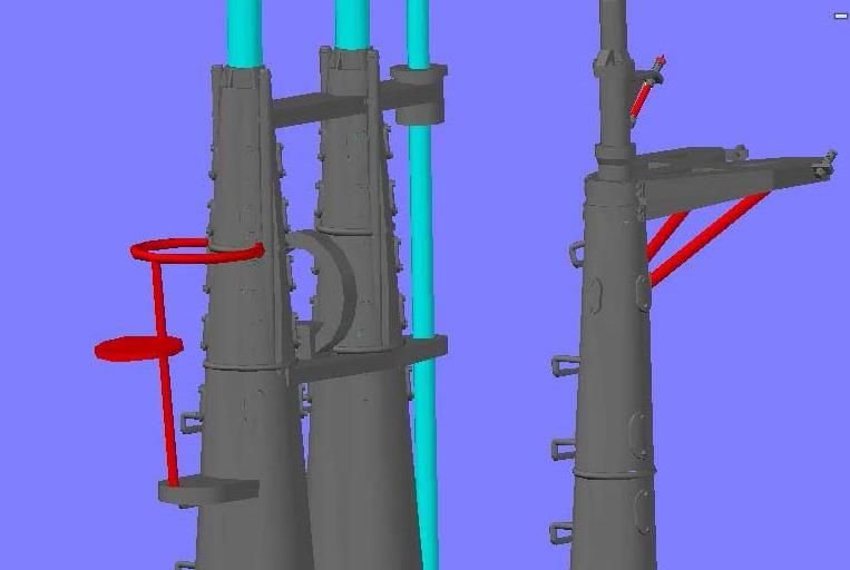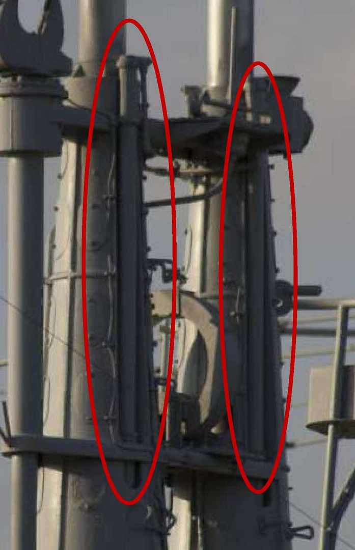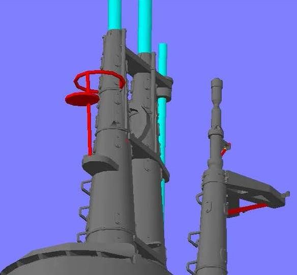 The tubes and small diameter pipes connecting them, poking out of the portside upper shears alongside each 'scope are the hoist cylinders for the scopes. All other lines running on the outside of the shears are electric cables to/from sensors and lighting. For full height extension, the cylinder didn't really have to move the scope all that far. The actual lift rods were connected to the scope inboard the hull on the yoke, just above the eyepiece box where you peek through. The yoke had the lower rotation bearing in it. For an example; the Type 2F attack 'scope barrel was @44' long. Lift it 20' and you've moved the head out to a ship's periscope depth (keel to head) of 64' (discounting some variables for the sake of explanation).