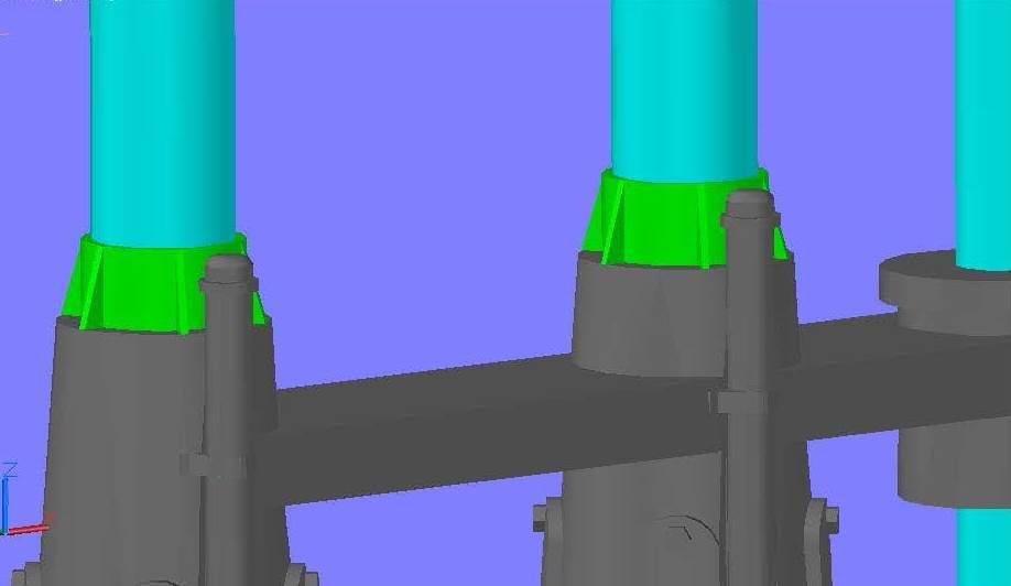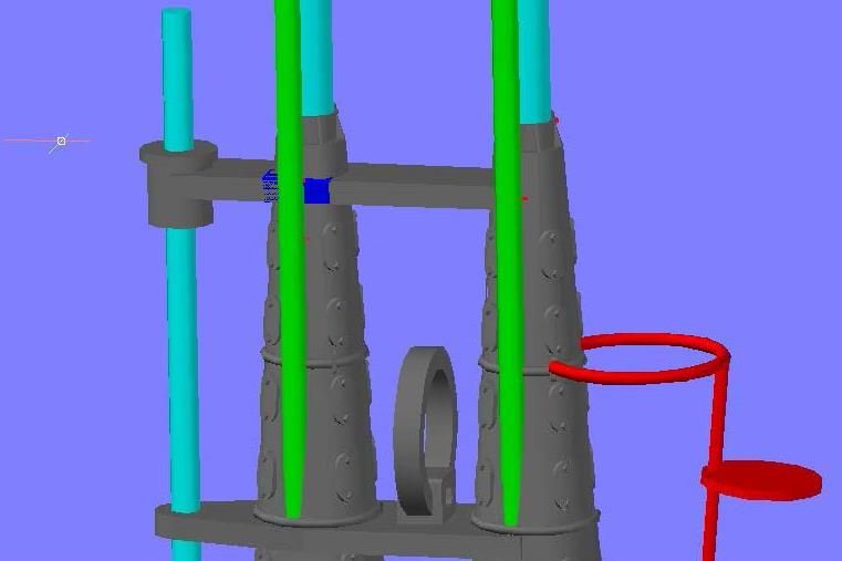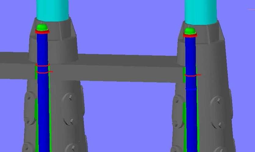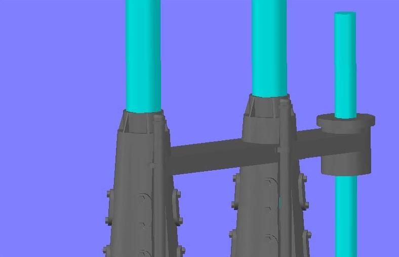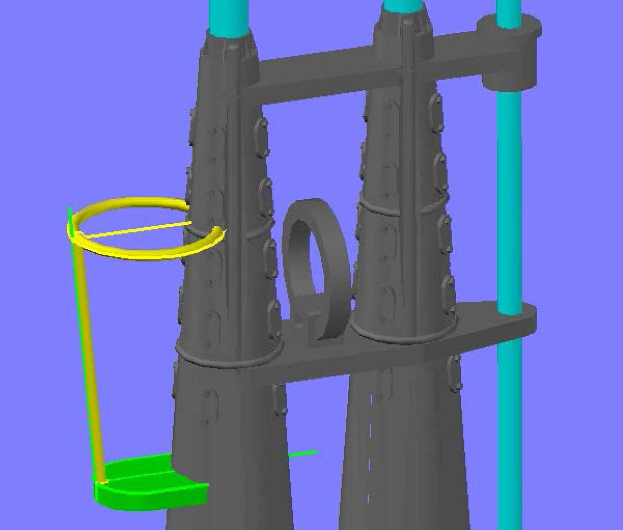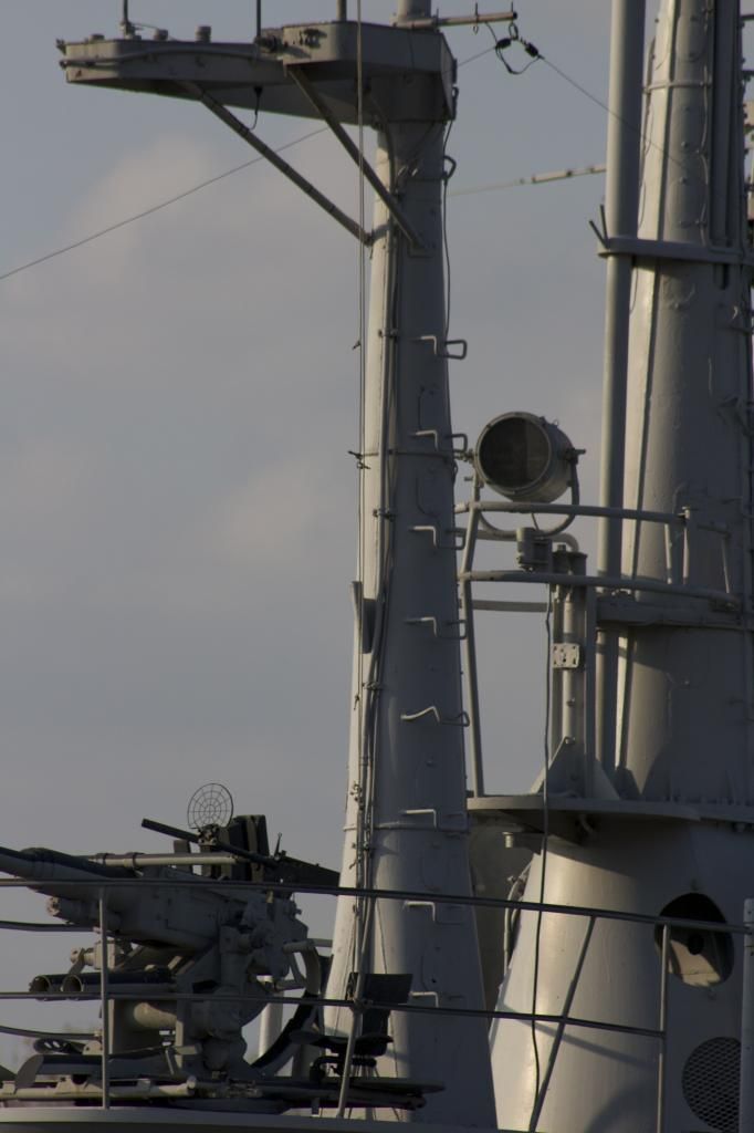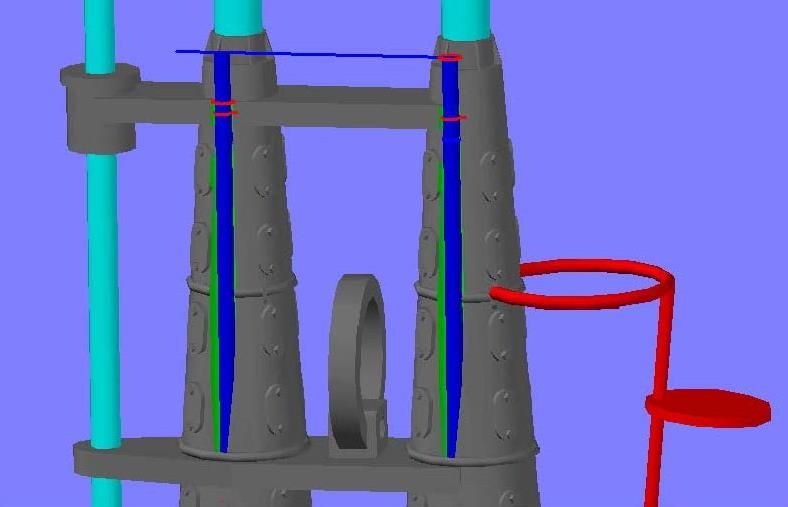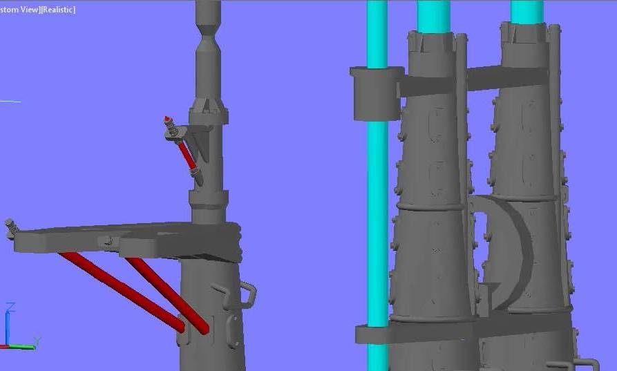 The tubes and small diameter pipes connecting them, poking out of the portside upper shears alongside each 'scope are the hoist cylinders for the scopes. All other lines running on the outside of the shears are electric cables to/from sensors and lighting. For full height extension, the cylinder didn't really have to move the scope all that far. The actual lift rods were connected to the scope inboard the hull on the yoke, just above the eyepiece box where you peek through. The yoke had the lower rotation bearing in it. For an example; the Type 2F attack 'scope barrel was @44' long. Lift it 20' and you've moved the head out to a ship's periscope depth (keel to head) of 64' (discounting some variables for the sake of explanation).