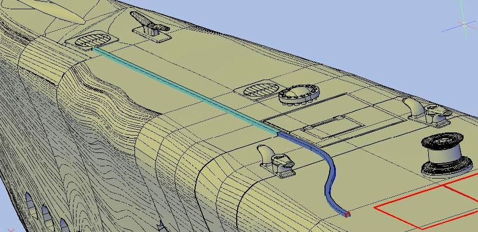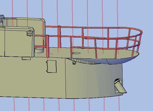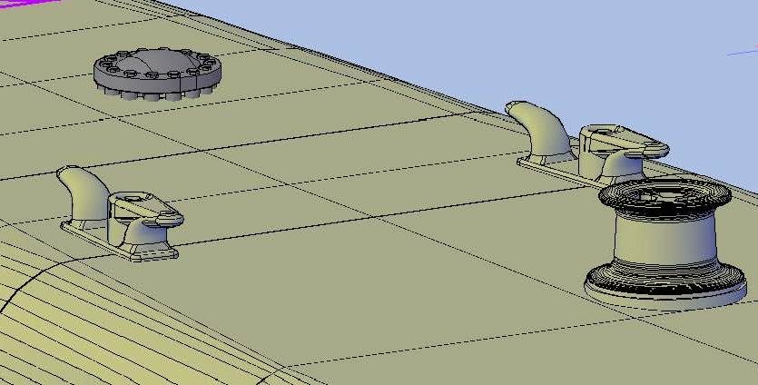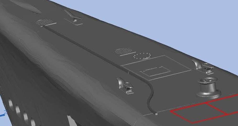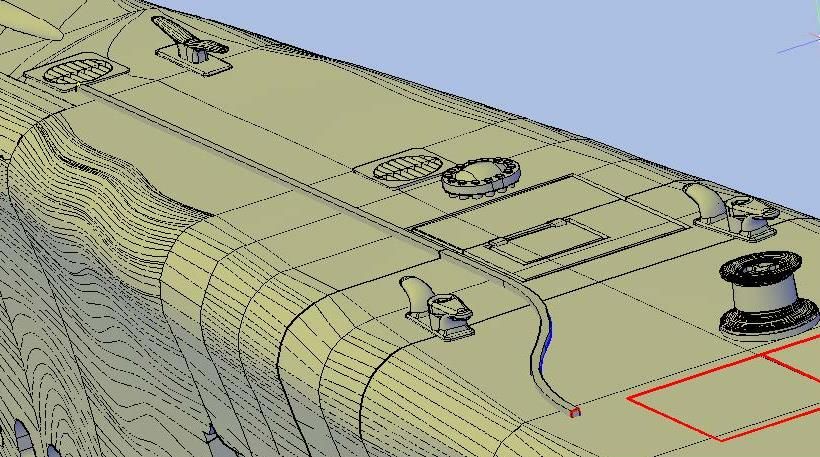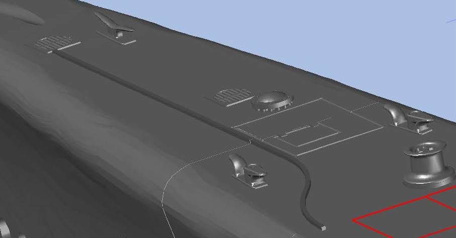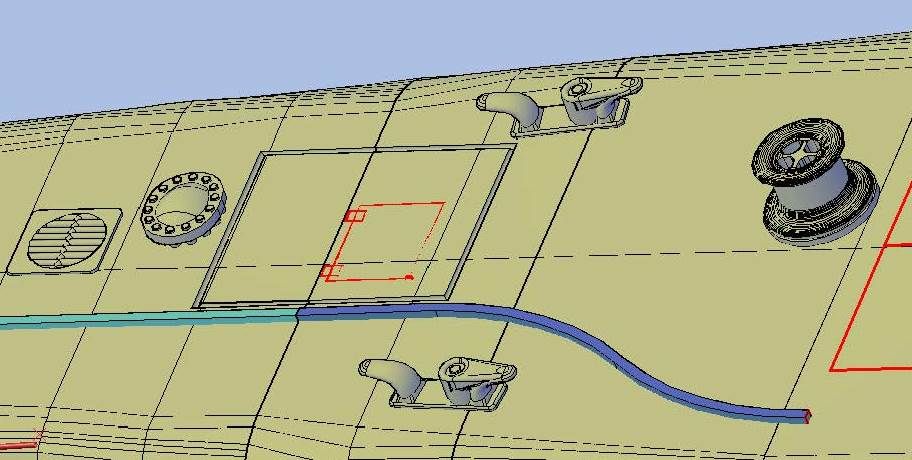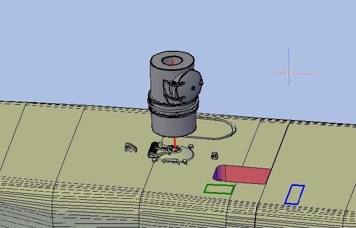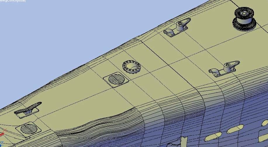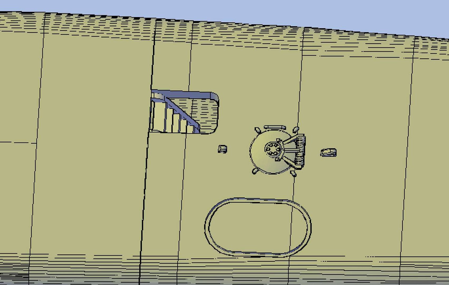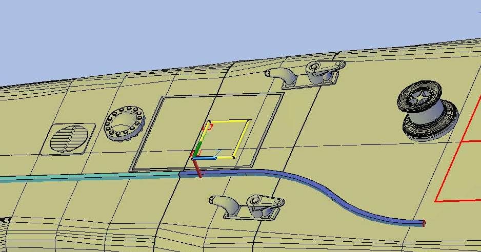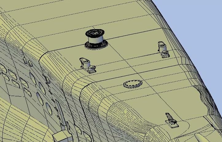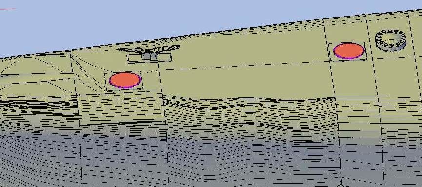 For the new (old) round buoy, since Paul says that they wouldn’t have been on the ship during the war, and that instead “a blank round metal plate would have been welded over the empty socketsâ€, I simply moved the circle up 0.010†and extrude it into the deck.