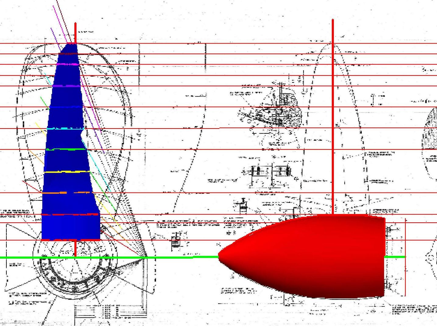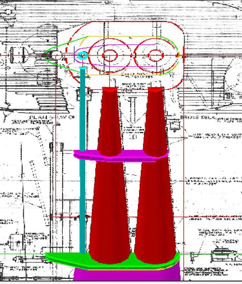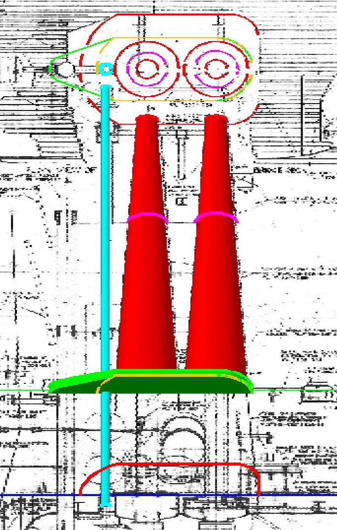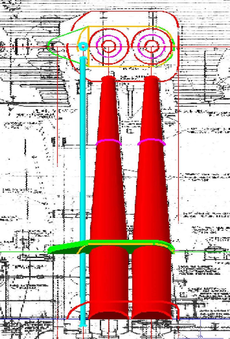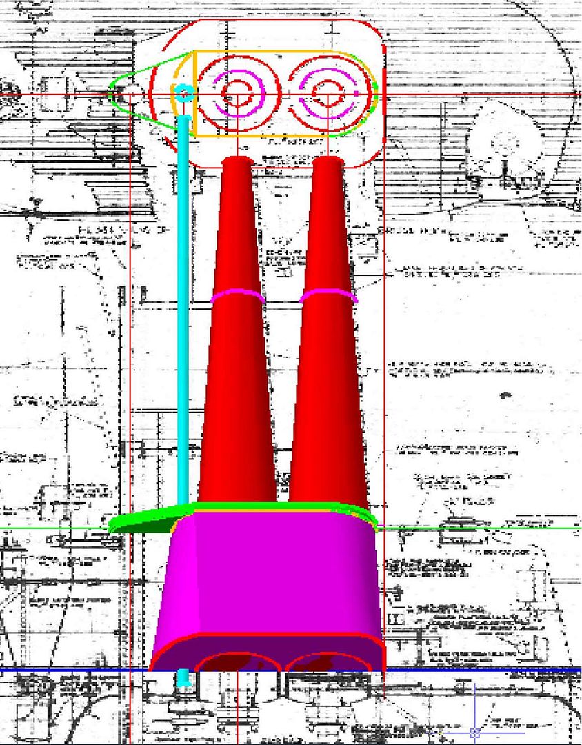 With the assembly completed, the next step was to copy and paste it into the Batfish drawing. I knew, more or less, what the horizontal positioning was, so I started by positioning the assembly at that point, but, in the end, the final positioning was done by eyeball. As you can see, this resulted in good alignment, and the two objects blend nicely into one another.