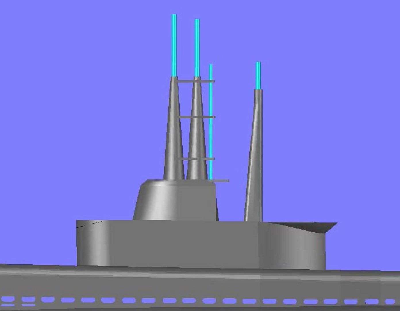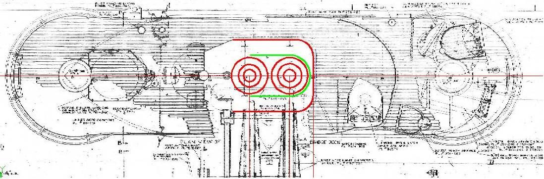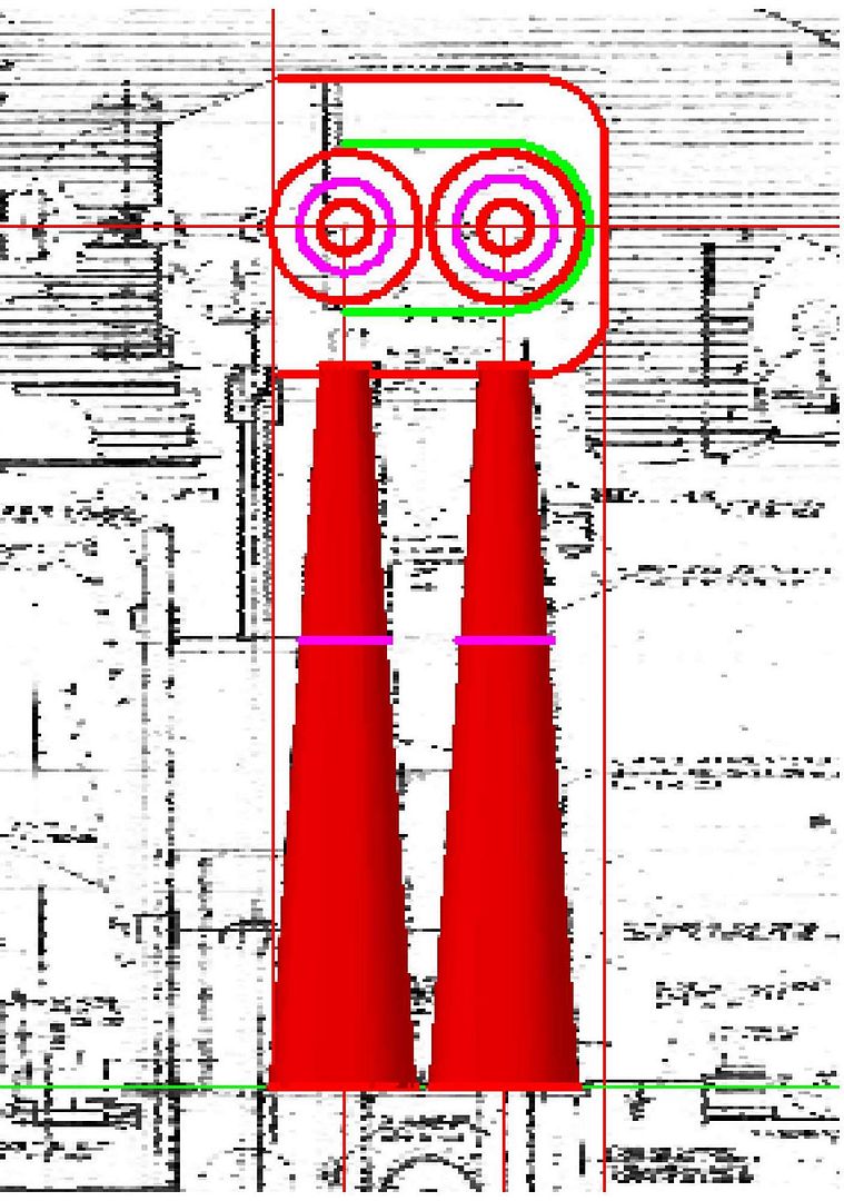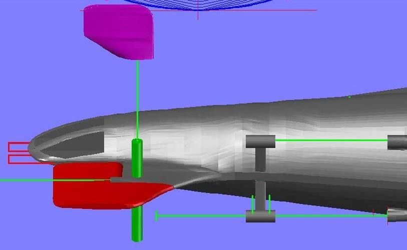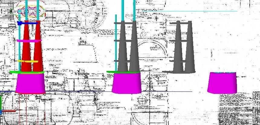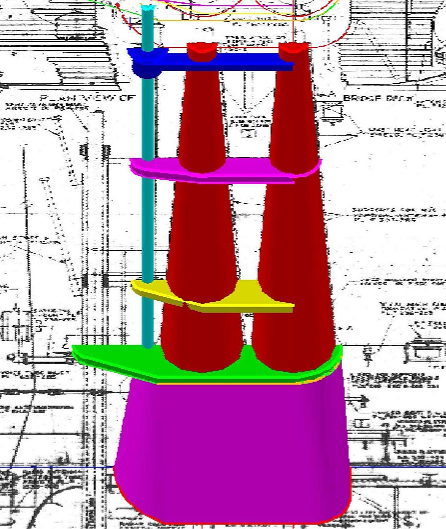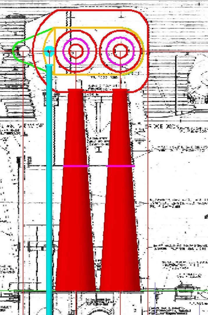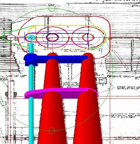 With the assembly completed, the next step was to copy and paste it into the Batfish drawing. I knew, more or less, what the horizontal positioning was, so I started by positioning the assembly at that point, but, in the end, the final positioning was done by eyeball. As you can see, this resulted in good alignment, and the two objects blend nicely into one another.