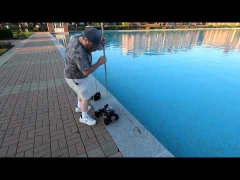 The crawler worked amazingly well, that was its first time running underwater. The air bubbles were just escaping from the frame underneath, the box stayed dry. As mentioned in the video, its an old 4wd RC truck with the original motor/radio removed and a new dry box added with a toothed belt drive and a sail winch servo moving the original steering arm via a flex shaft. The 'mines' on the string hold the string up to give a place to grab it with the hook-on-a-stick to get it back out of the pond. It was a big hit at the Carmel regatta, and won the Big Dave Engineering Award. Dave would have loved it!