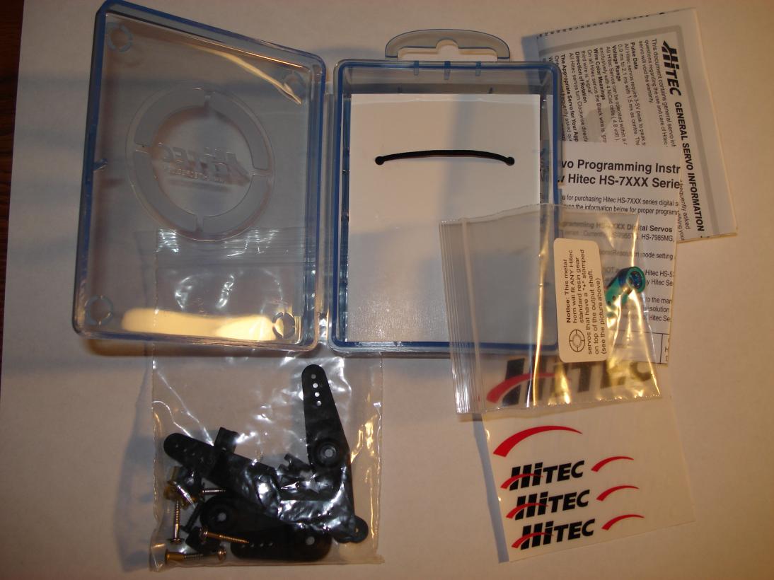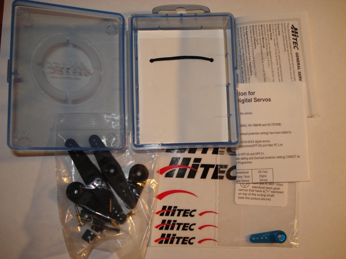 1. 2x Hitec Karbonite Programmable Coreless digital servos. Specifically they are HS-7966HB servos. They work just fine and I'm selling them as a set for $38.00 via USPS Priority Mail shipping to anywhere in the lower 48.