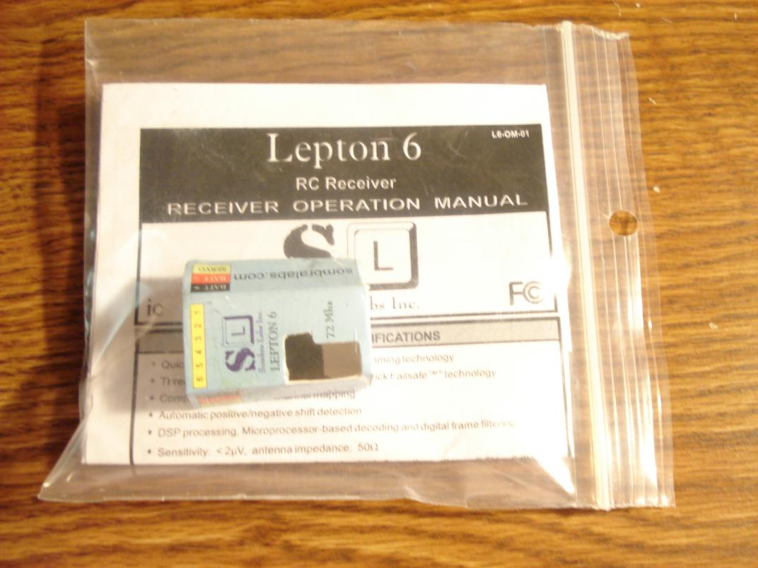 Added items: Lepton 6 by Sombra Labs. Comes with a GWS crystal so it's on Channel 61 (75 MHz). Also comes with a sticker, original cardboard "case" and instructions. Note that I inserted a plug so the receiver can be removed from the antenna. The antenna is also not full length, so to be optimally used, it will need a full length antenna/aerial.