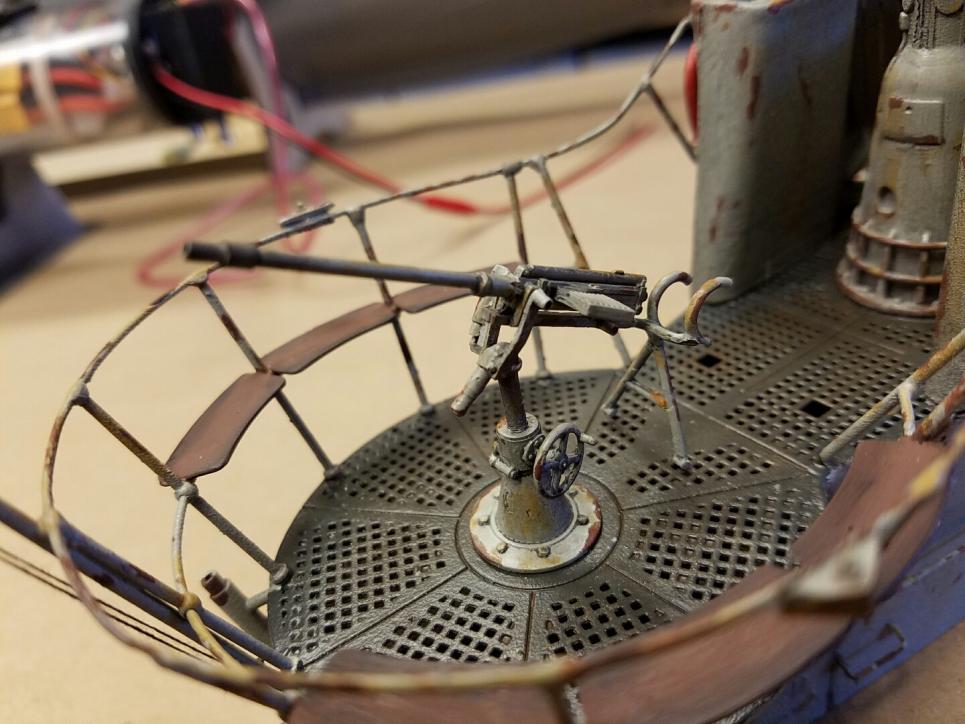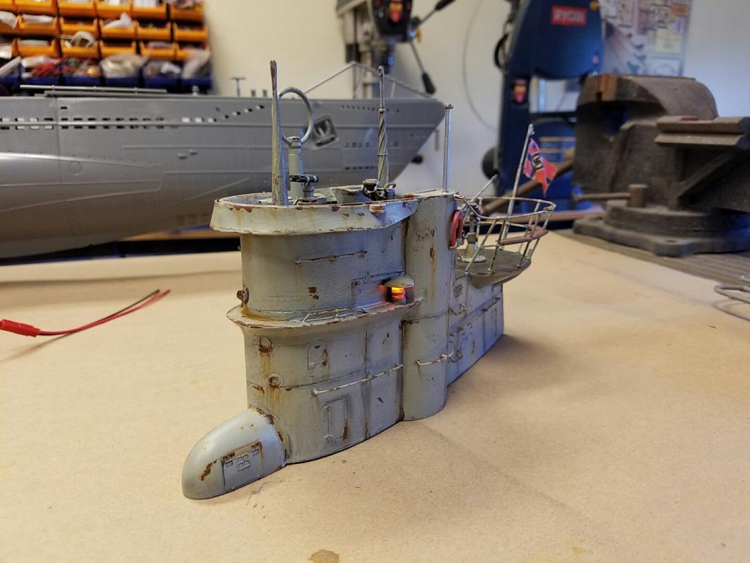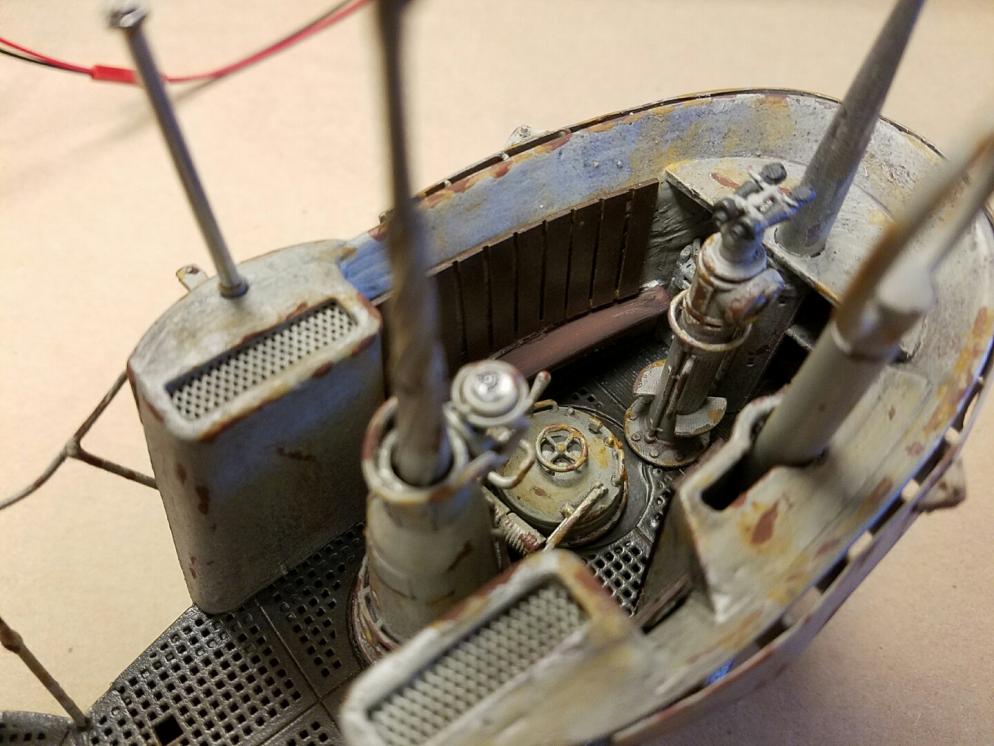As of right now, she is unbadged, but if you have a specific boat in mind, I can add the emblem on the tower at no charge. The assemblies for the periscopes, spotter glasses and front area were all upgrades ordered off of Shapeways, and are far more detailed and accurate than the stock pieces that come with the tower kit. The hatch opens and closes. There are three LED lights in the appropriate locations that are currently driven off of a 9V battery harness, but can easily be hooked up to the 12V or 11.1V system in an RC boat (the LED's are set up for 12-14V max, so underdriving them is a good thing!)