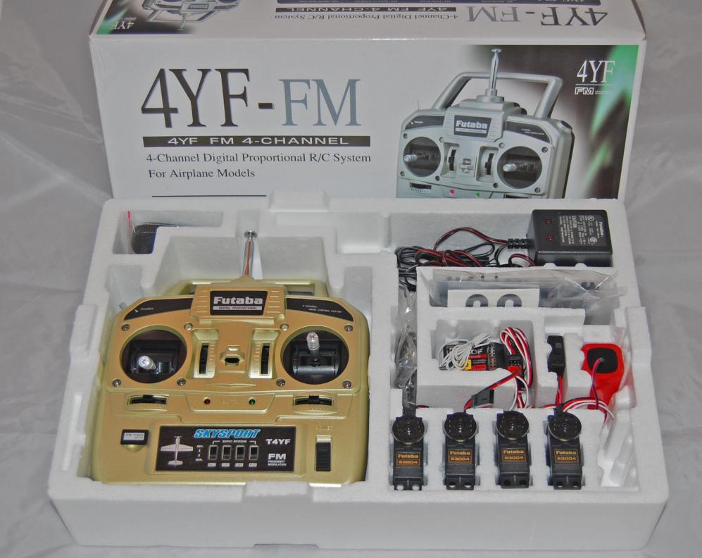 This is a brand new 75MHz Futaba 4YF 4-channel FM radio system with NiCd batteries, 120V AC charger, frequency flags, neck strap, servo tray, switch harness, four S3004 servos, servo mounting hardware, transmitter and receiver crystals and R168DF Receiver.