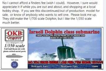 1) OKB Grigorov 1/350 scale Israeli Dolphin Class Submarine. Yes I know it is still on their website, but they no longer make it, nor have any in stock. They still sell the 1/700 scale one, but I prefer the 1/350 scale.