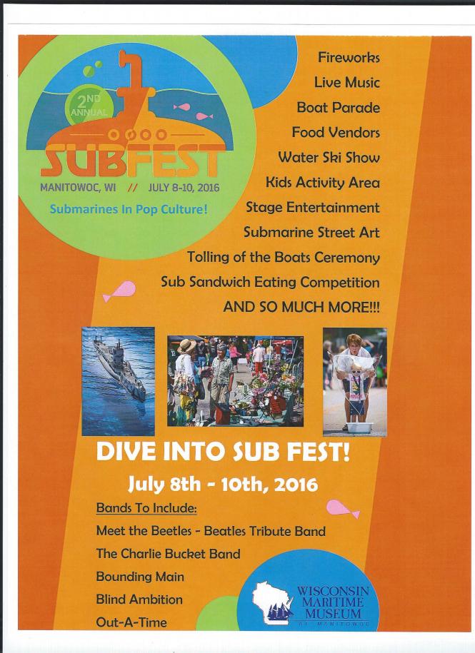 The dates for Sub Fest 2016 are July 8th thru the 10th. Visit the Wisconsin Maritime Museums web sight for more info on hotels and camp grounds. Hopefully they will open up the USS Cobia for us to sleep on over night again. Any questions contact Jim Smith (sub ron 6) at jvsmith@lakefield.net